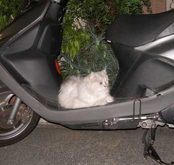 | バイクを置いている我が家の前は、川風が通りぬけて涼しいのです。清子の要求で夜は外に出します。 |